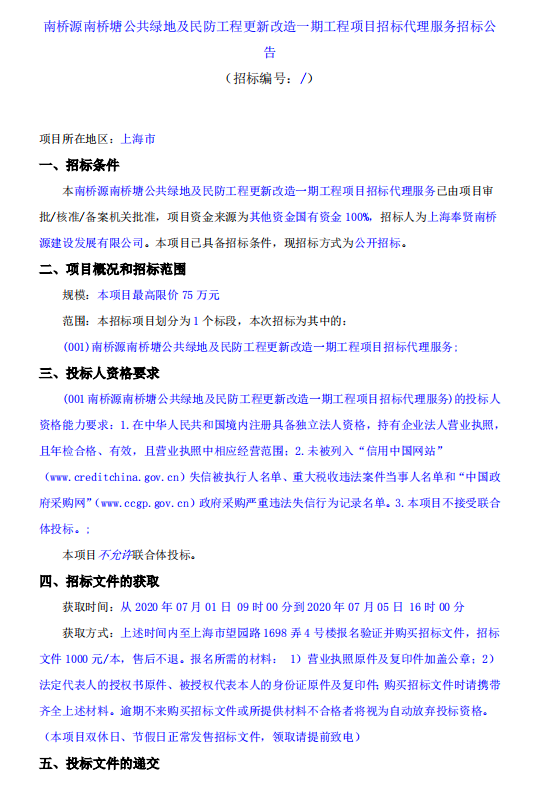 南橋源南橋塘公共綠地及民防工程更新改造一期工程項目招標代理服務-招標公告